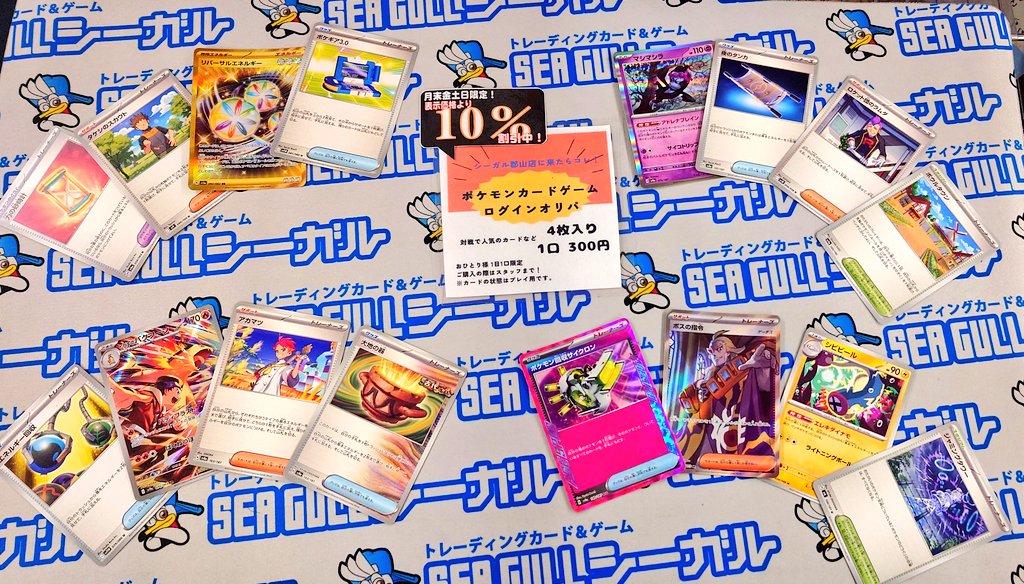 シーガル郡山店です! 月末金土日割引 #プレミアムフライデー ポケモンカードゲーム 《ログインオリパ》 6/27~6/30まで10%割引中です! 対戦で人気のカード4枚入り 今だけ 1口 270円! さらに 1日3口までご購入いただけます! お求めの際はレジスタッフまで🙏 本日こんな一例追加しました✨