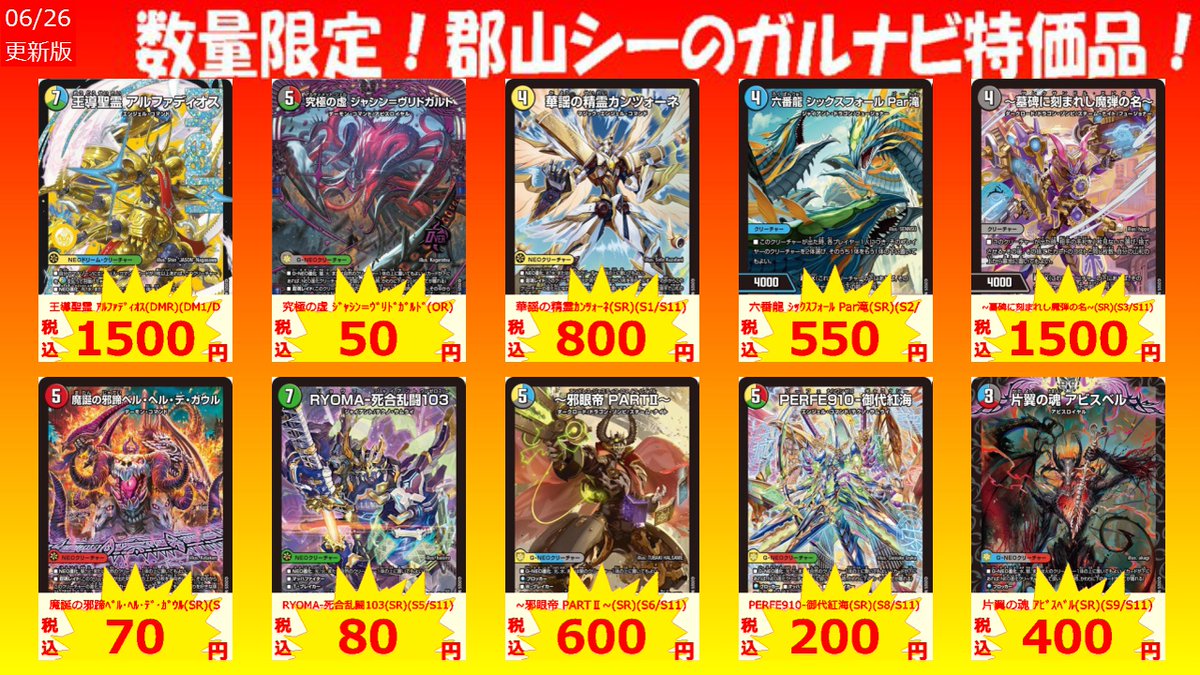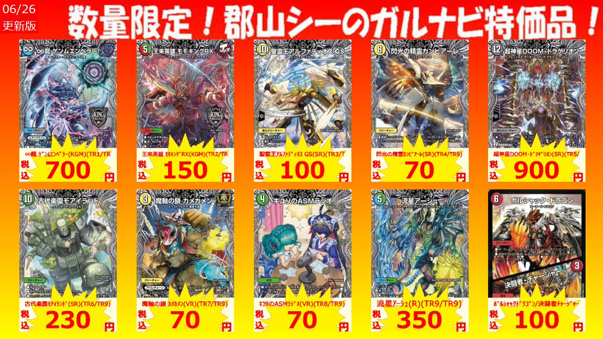 数量限定!郡山シー限定ガルナビ特価品 ~凍てついた時間~(VR)(2/77) ¥100 王闘の大地(VR)(11/77) ¥100 喜像エル(VR)(9/77) ¥150 #デュエマ #シーガル郡山 #アツアツ特価