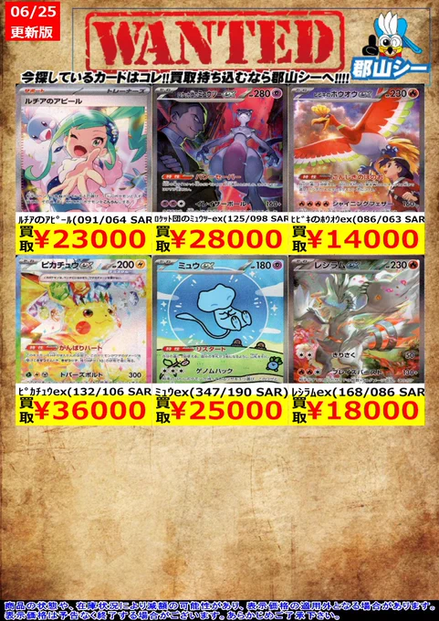 シーガル郡山店ポケカ数量限定お買取り情報更新です!よろしくお願いいたします! ※商品の状態や在庫状況により減額の可能性があり、表示価格の適用外となる場合がございます。 ミジュマル(102/086 AR) ¥1,300 ドリュウズex(171/086 SAR) ¥1,200 ピカチュウ(236/190 S) ¥2,000