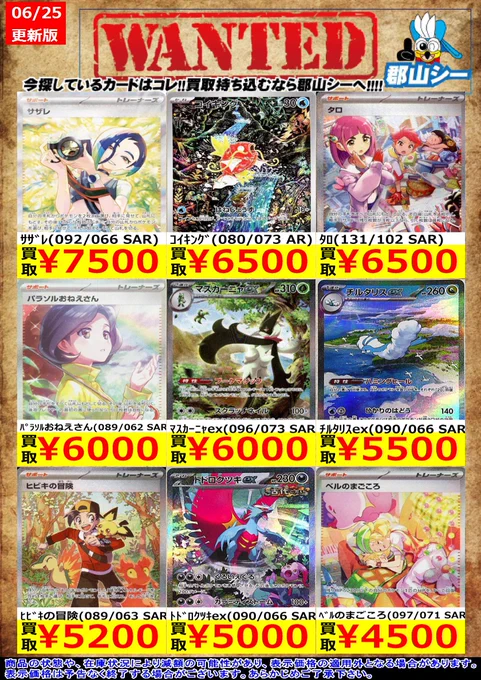 シーガル郡山店ポケカ数量限定お買取り情報更新です!よろしくお願いいたします! ※商品の状態や在庫状況により減額の可能性があり、表示価格の適用外となる場合がございます。 コイキング(080/073 AR) ¥6,500 タロ(131/102 SAR) ¥6,500 ミカンのまなざし(135/106 SAR) ¥2,500