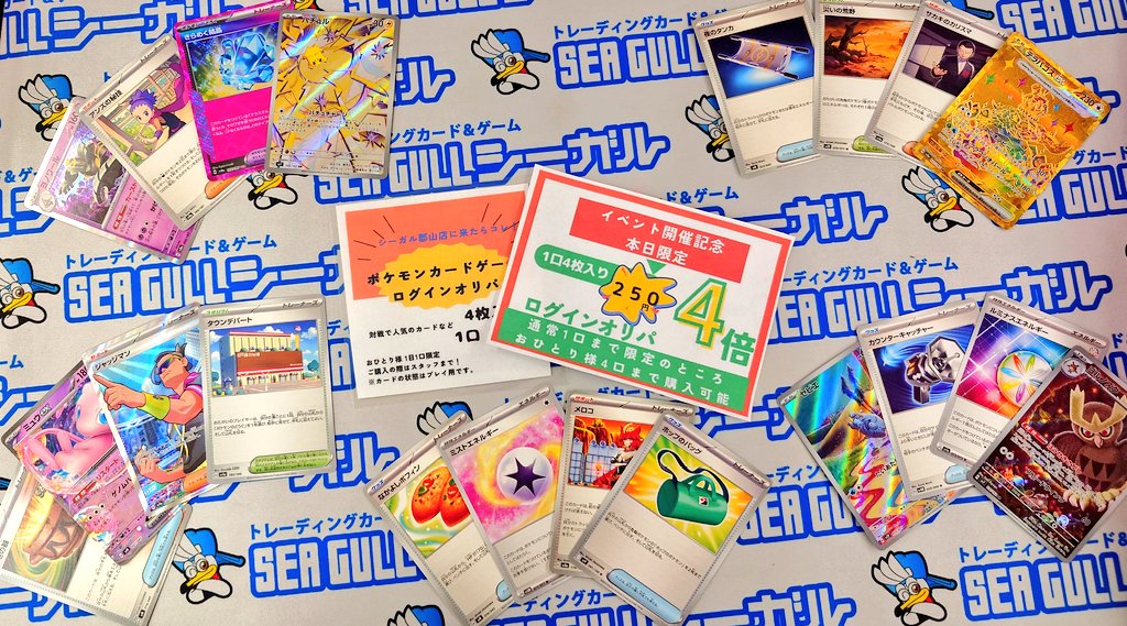 シーガル郡山店です! ポケモンカードゲーム 〝ログインオリパ〟 対戦で人気のカードなどが入って 1口4枚入り 300円! おひとり様1日1口限定! のところ本日イベント開催記念 ✨1口250円おひとり様4口まで✨ ご購入いただけます😊 お求めの際はレジスタッフまで🙏 こんな一例追加しました!