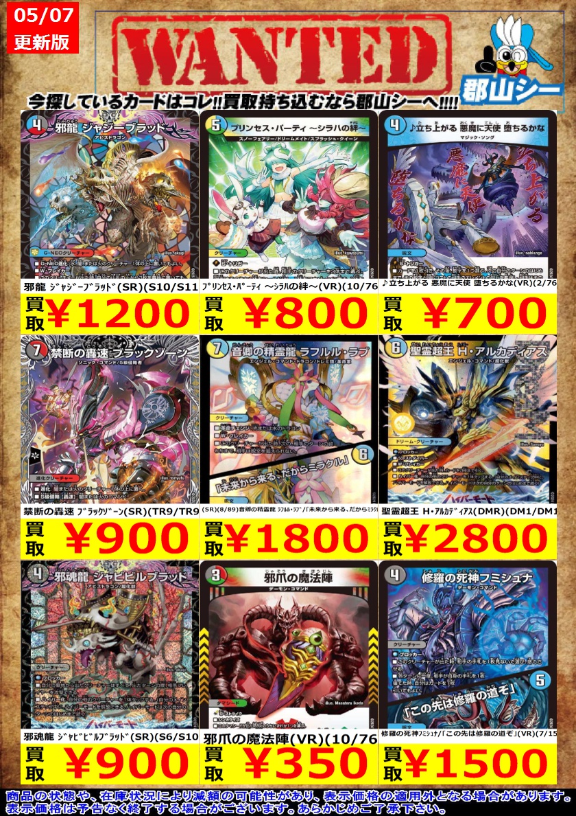 シーガル郡山店デュエマお買取り情報! ※商品の状態や在庫状況により減額の可能性があり表示価格の適用外となる場合がございます 邪龍 ジャジーブラッド(SR)(S10/S11) ¥1,200 ♪立ち上がる 悪魔に天使 堕ちるかな(VR)(2/76) ¥700 プリンセス・パーティ ~シラハの絆~(VR)(10/76) ¥800
