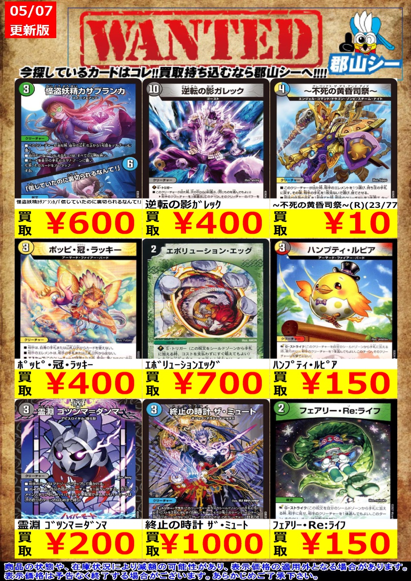 シーガル郡山店デュエマノーマルお買取り情報!! ※商品の状態や在庫状況により減額の可能性があり、表示価格の適用外となる場合がございます。 逆転の影ガレック ¥400 怪盗妖精カサブランカ/「信じていたのに裏切られるなんて!」 ¥600 ~不死の黄昏司祭~(R)(23/77) ¥10