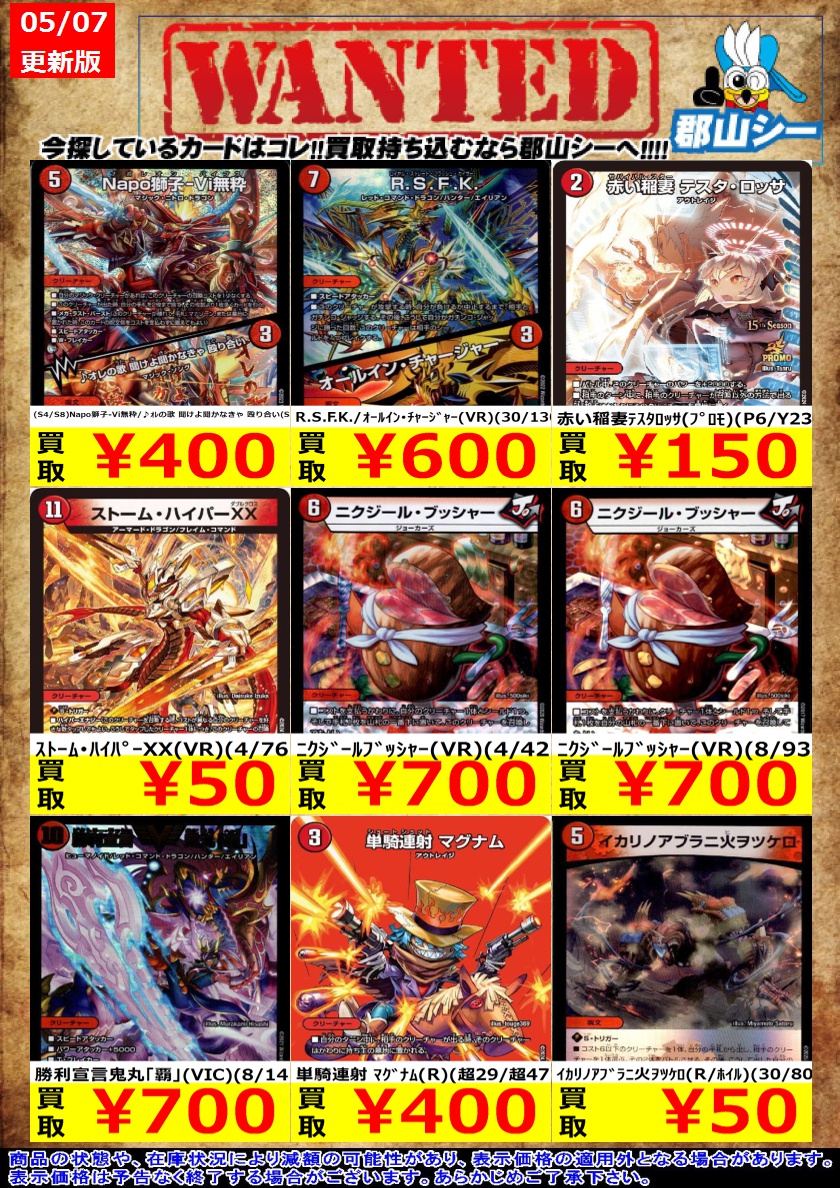 シーガル郡山店デュエマお買取り情報!! ※商品の状態や在庫状況により減額の可能性があり、表示価格の適用外となる場合がございます。 ストーム・ハイパーXX(VR)(4/76) ¥50 赤い稲妻テスタロッサ(プロモ)(P6/Y23) ¥150 (S4/S8)Napo獅子-Vi無粋/♪オレの歌 聞けよ聞かなきゃ 殴り合い(SR) ¥400