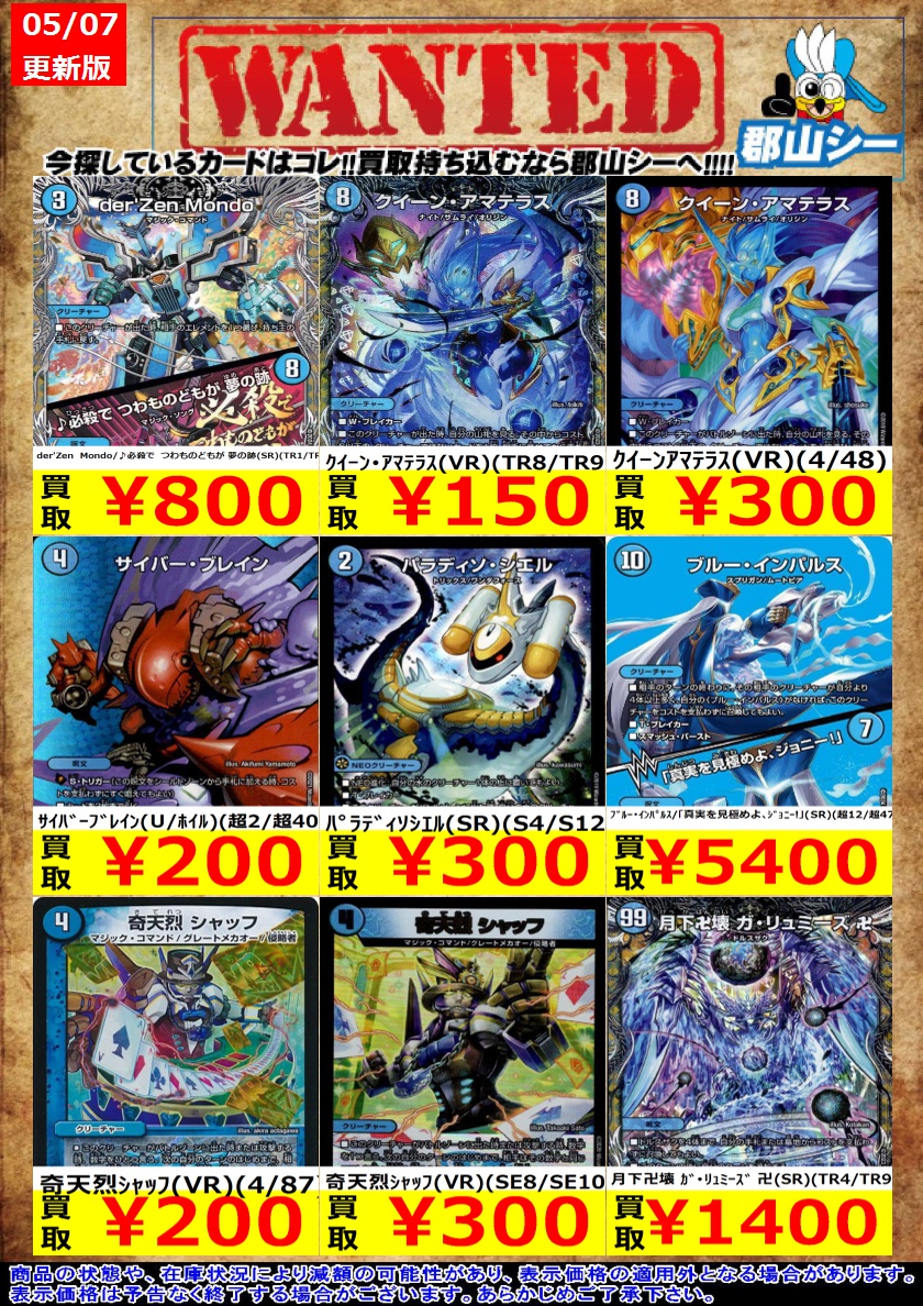 シーガル郡山店デュエマお買取り情報!! ※商品の状態や在庫状況により減額の可能性があり、表示価格の適用外となる場合がございます。 クイーン・アマテラス(VR)(TR8/TR9) ¥150 奇天烈シャッフ(VR)(4/87) ¥200 五番龍 レイクポーチャー ParZero(SR)(S2/S8) ¥200