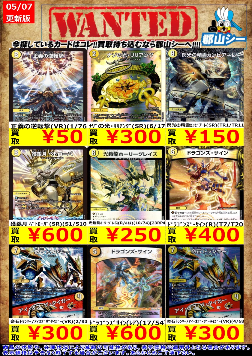 シーガル郡山店デュエマお買取り情報!! ※商品の状態や在庫状況により減額の可能性があり、表示価格の適用外となる場合がございます。 ア:エヌ:マクア(SR)(S5/S8) ¥150 インフェル星樹(VR)(7/76) ¥350 エボリューション・エッグ(U)(超40/超50) ¥700