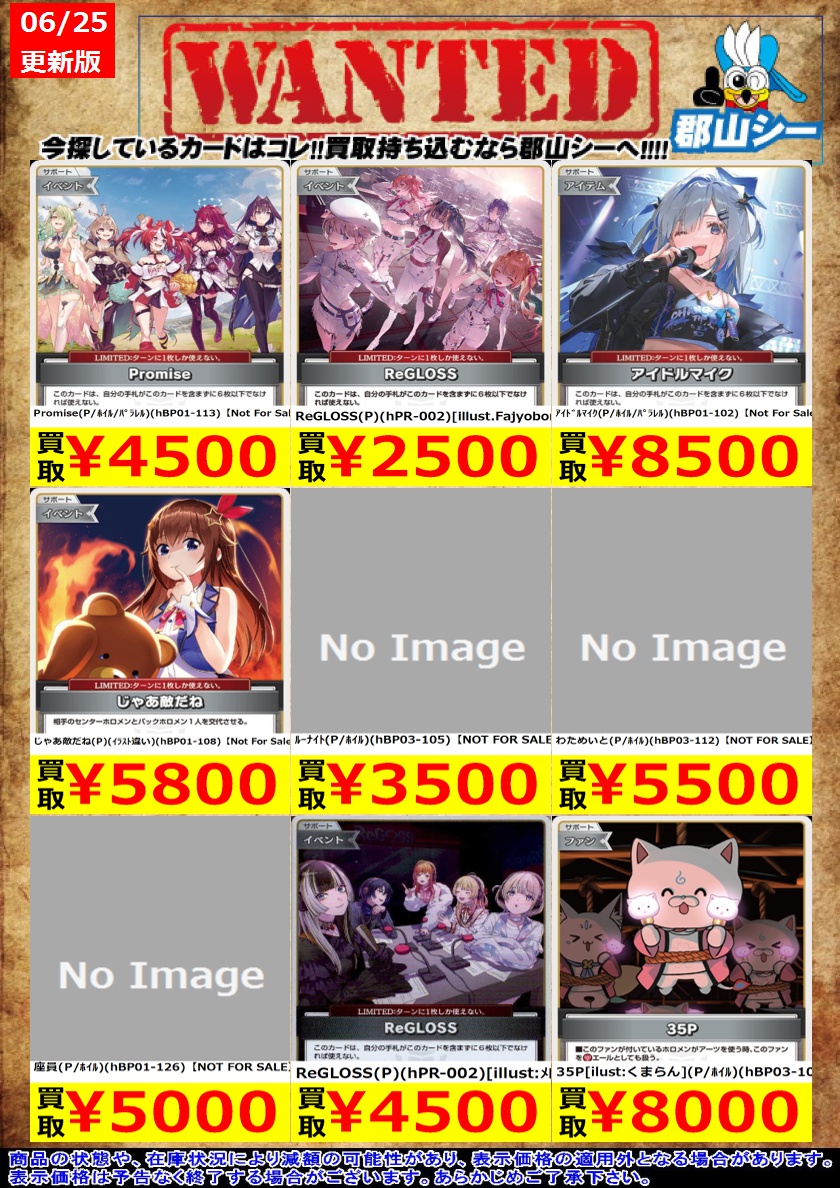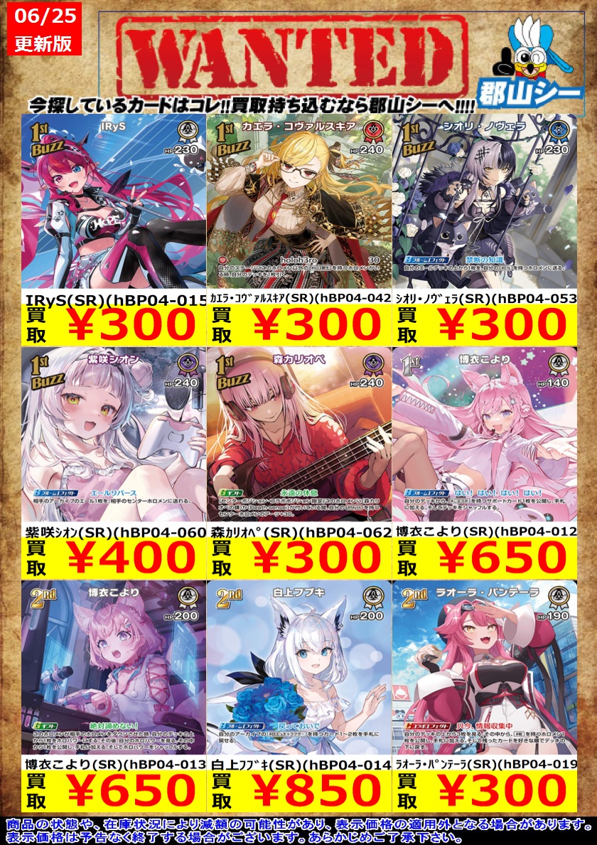 シーガル郡山店ホロライブOCGお買取り情報!! ※商品の状態や在庫状況により減額の可能性があり、表示価格の適用外となる場合がございます。 紫エール(SY)(hY05-004) ¥1,500 黄エール(SY)(hY06-004) ¥1,500 緑エール(SY)(hY02-005) ¥750