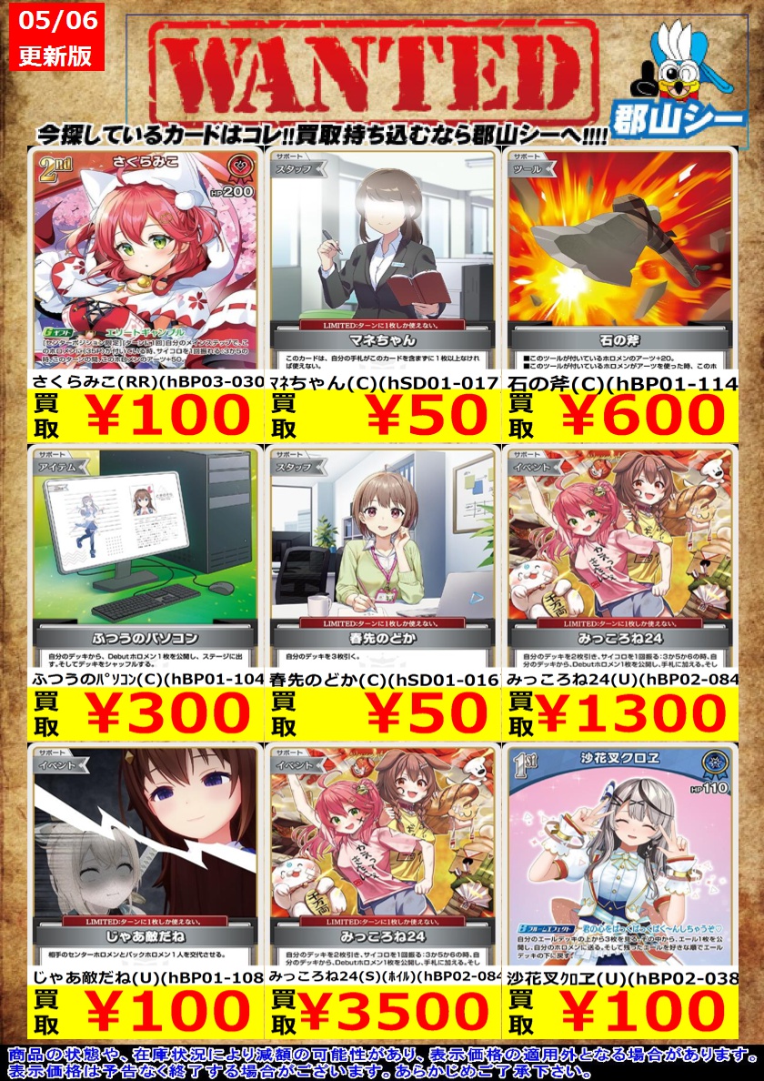 シーガル郡山店ホロライブOCGお買取り情報!! ※商品の状態や在庫状況により減額の可能性があり、表示価格の適用外となる場合がございます。 春先のどか(C)(hSD01-016) ¥50 マネちゃん(C)(hSD01-017) ¥50 宝鐘マリン(R)(hBP02-032) ¥50