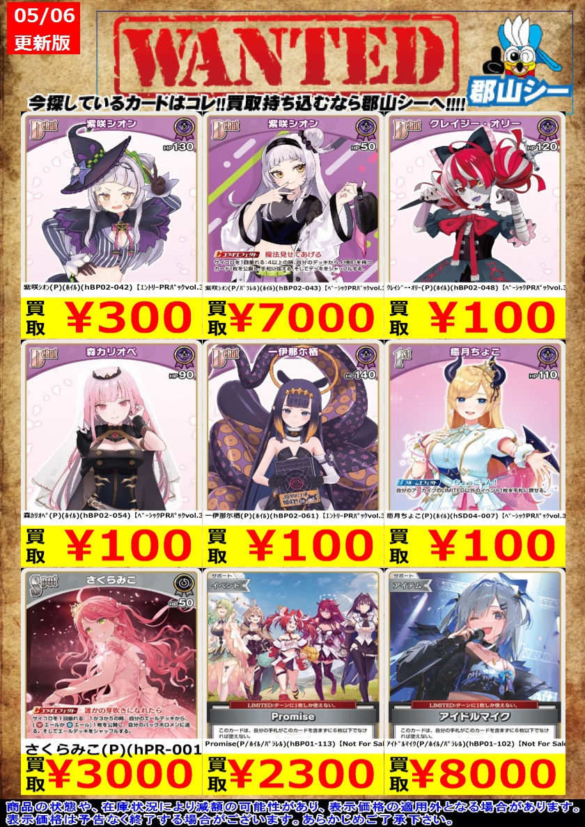 シーガル郡山店ホロライブOCGお買取り情報!! ※商品の状態や在庫状況により減額の可能性があり、表示価格の適用外となる場合がございます。 こぼ・かなえる(SR)(hBP03-045) ¥200 パヴォリア・レイネ(SR)(hBP02-023) ¥400 兎田ぺこら(SR)(hBP03-023) ¥400