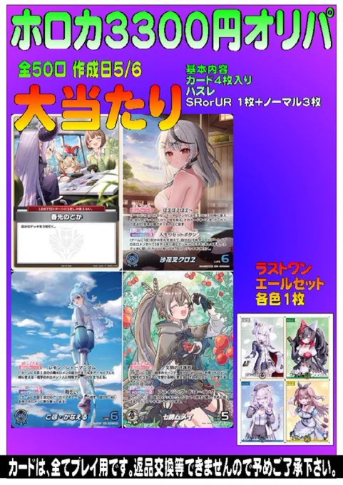 シーガル郡山店ホロライブOCGお買取り情報!! ※商品の状態や在庫状況により減額の可能性があり、表示価格の適用外となる場合がございます。 緑エール(大神ミオ)(SY)(hY02-002) ¥1,600 白エール(姫森ルーナ)(SY)(hY01-004) ¥1,400 青エール(沙花叉クロヱ)(SY)(hY04-002) ¥2,200