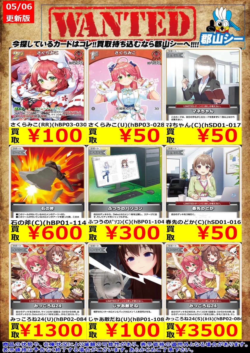 シーガル郡山店ホロライブOCGお買取り情報!! ※商品の状態や在庫状況により減額の可能性があり、表示価格の適用外となる場合がございます。 春先のどか(C)(hSD01-016) ¥50 マネちゃん(C)(hSD01-017) ¥50 沙花叉クロヱ(U)(hBP02-038) ¥100
