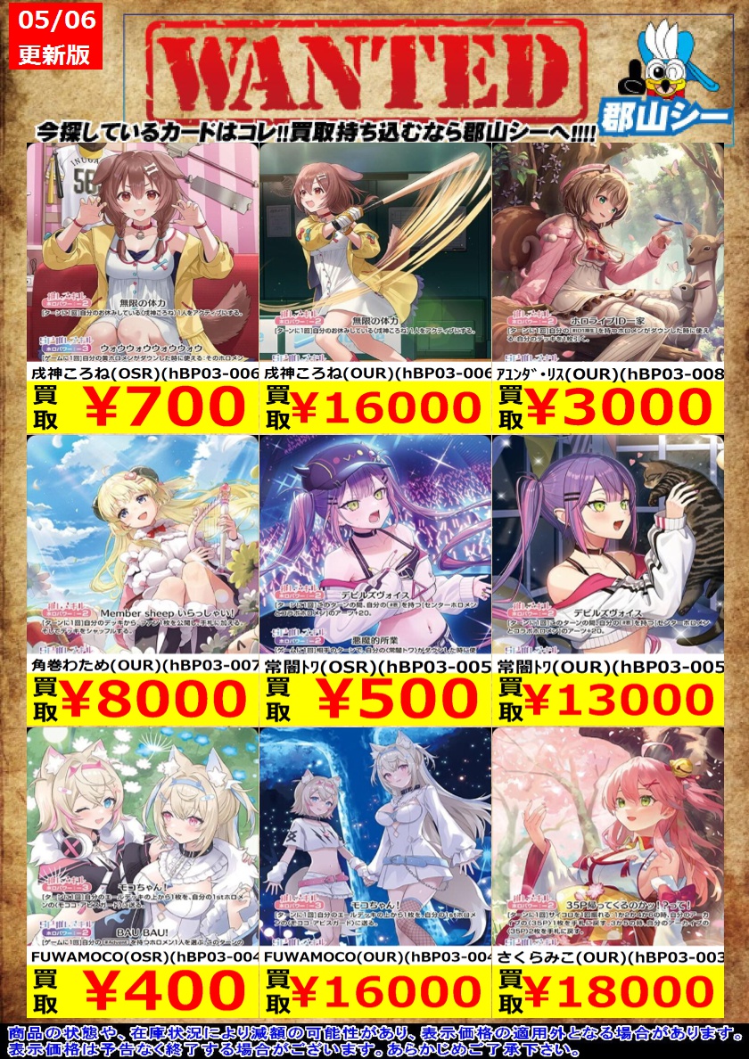 シーガル郡山店ホロライブOCGお買取り情報!! ※商品の状態や在庫状況により減額の可能性があり、表示価格の適用外となる場合がございます。 アキ・ローゼンタール(OUR)(hBP01-003) ¥4,200 姫森ルーナ(OUR)(hBP03-001) ¥8,000 鷹嶺ルイ(OUR)(hBP01-005) ¥8,500