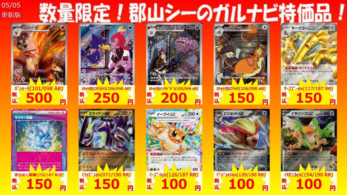 数量限定郡山シー限定ガルナビ特価品! ※買取金額ではございません※ パールル(102/098 AR) ¥80 テツノカイナex(054/187 RR) ¥100 ロケット団のラッタ(108/098 AR) ¥150