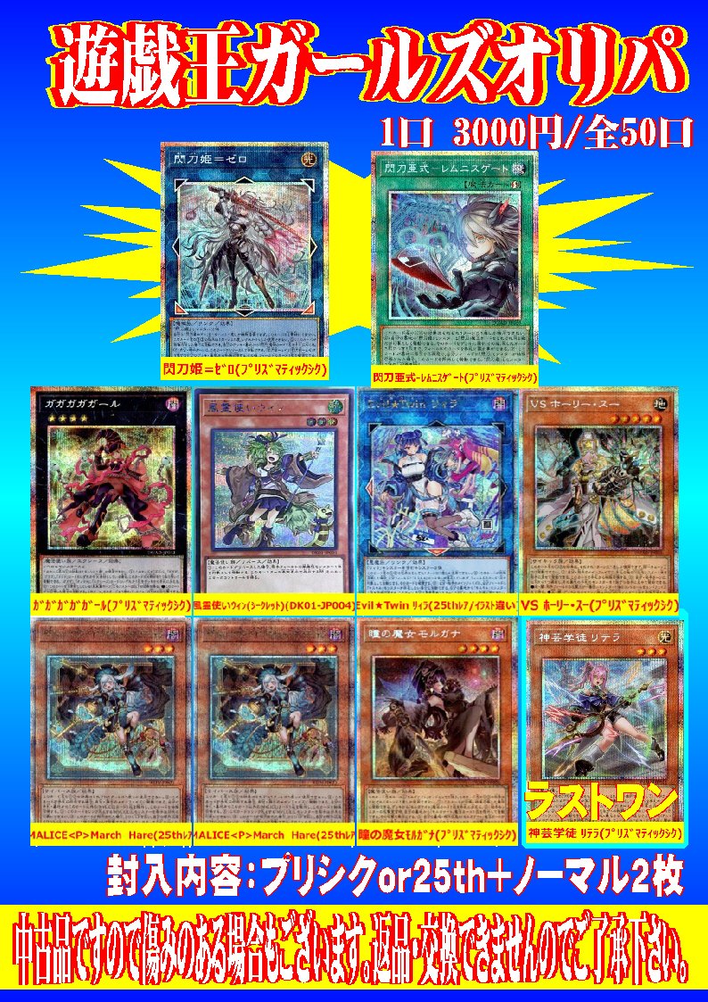 シーガル郡山店です! ✨遊戯王ガールズオリパ✨ こちら作成致しました! ハズレでも女の子の25thかプリシクが 1枚確定で入っています! 是非お試しくださいませ( ˶’ᵕ’˶ )
