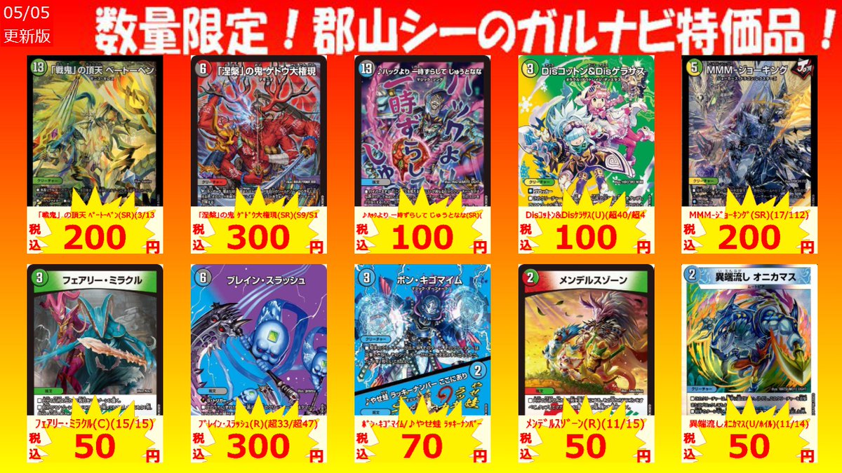 数量限定!郡山シー限定ガルナビ特価品 メンデルスゾーン(R)(11/15) ¥50 忍蛇の聖沌 c0br4(R)(超27/超47) ¥100 Disコットン&Disケラサス(U)(超40/超47) ¥100 #デュエマ #シーガル郡山 #アツアツ特価