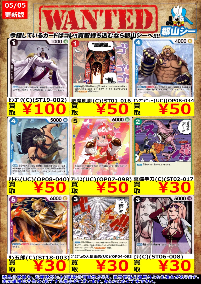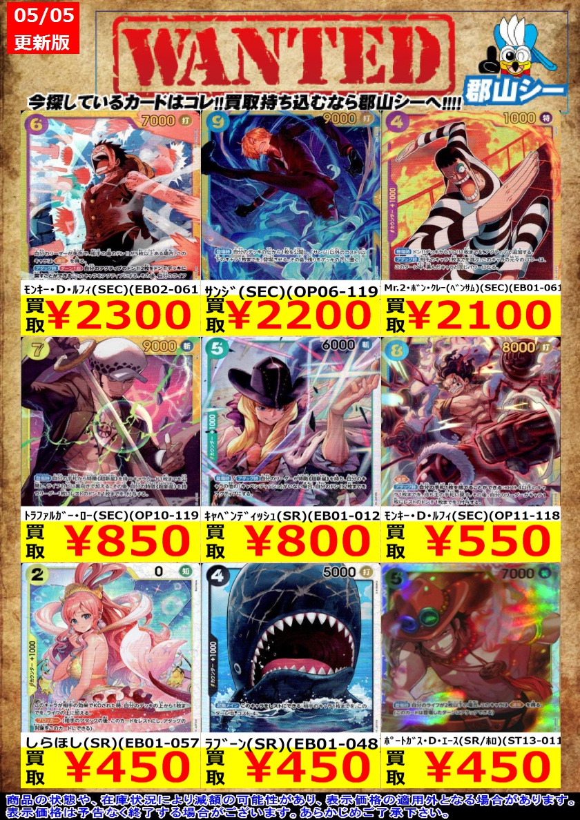 シーガル郡山店ワンピースお買取り情報!※商品の状態や在庫状況により減額の可能性があり、表示価格の適用外になる場合がございます。予めご了承ください。 エドワード・ニューゲート(SR)(OP08-043) ¥50 モンキー・D・ルフィ(SEC)(OP09-119) ¥100 #高価買取 #ワンピース #シーガル郡山