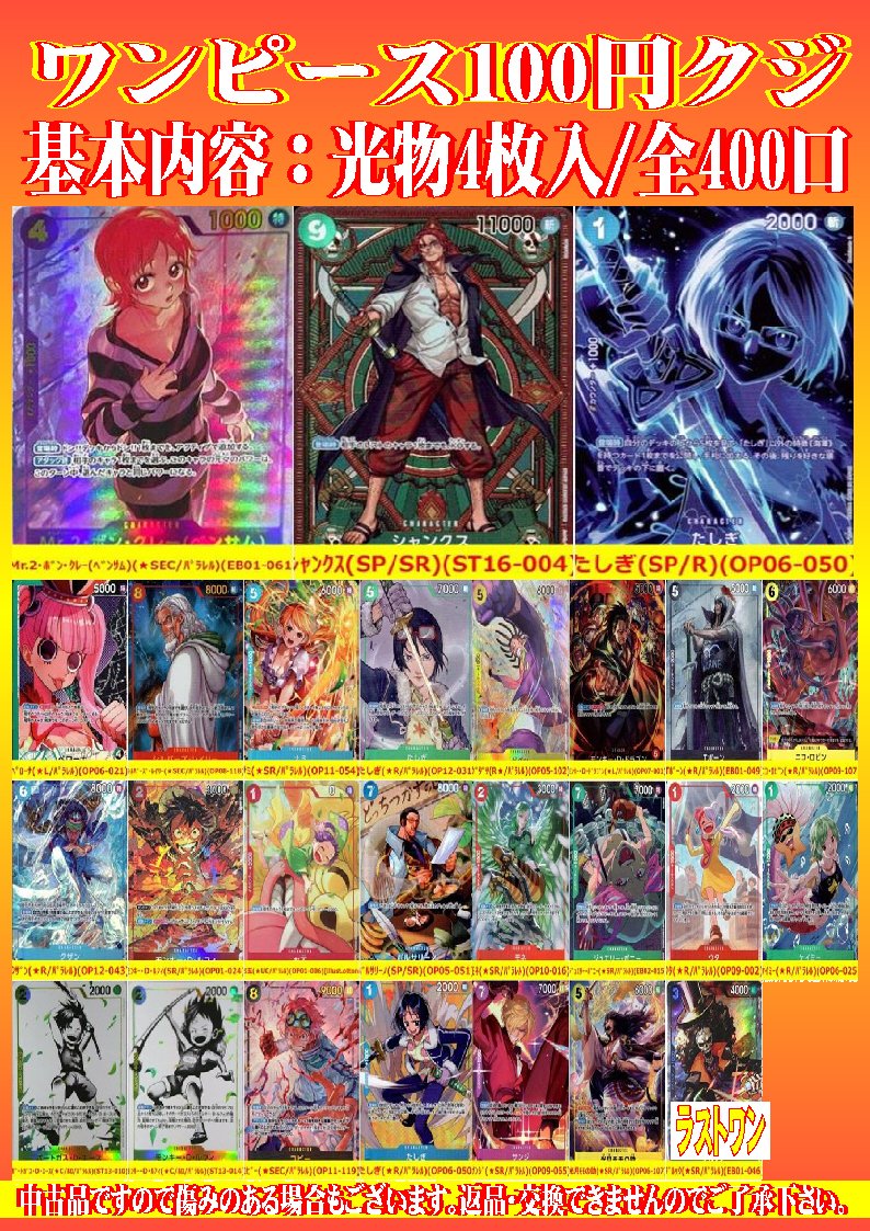 シーガル郡山店です。 ワンピ100円くじ作成致しました‼️ よろしくお願いします。