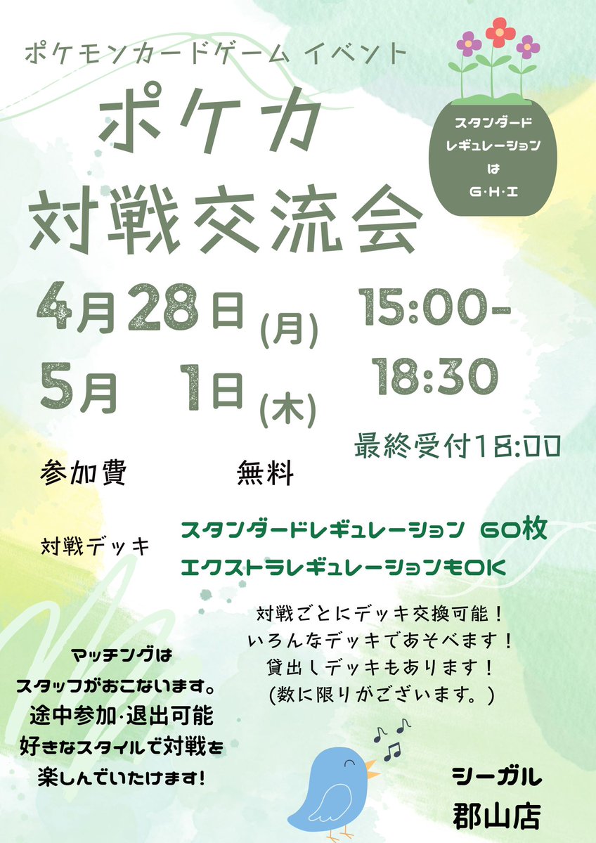シーガル郡山店です! 本日15:00~ 参加費無料 デュエルスペースにて ポケカ対戦交流会 ・スタンダード ・エクストラ 一戦だけでもOK! スタンダードの貸し出しデッキもございます! ご参加お待ちしております😊