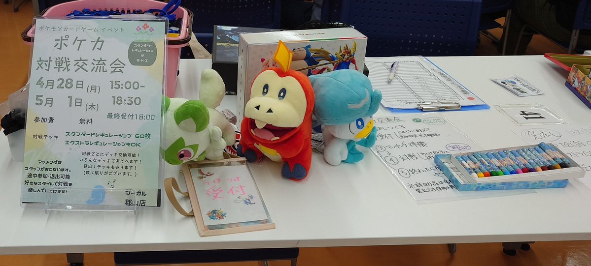 シーガル郡山店です! ポケモンカード 対戦交流会 現在までに15名の方に遊びに来ていただいています! スタンダードもエクストラも 手ぶらでも遊べます! 1戦からでもOK! ご参加お待ちしております😊 受付18:00までです!
