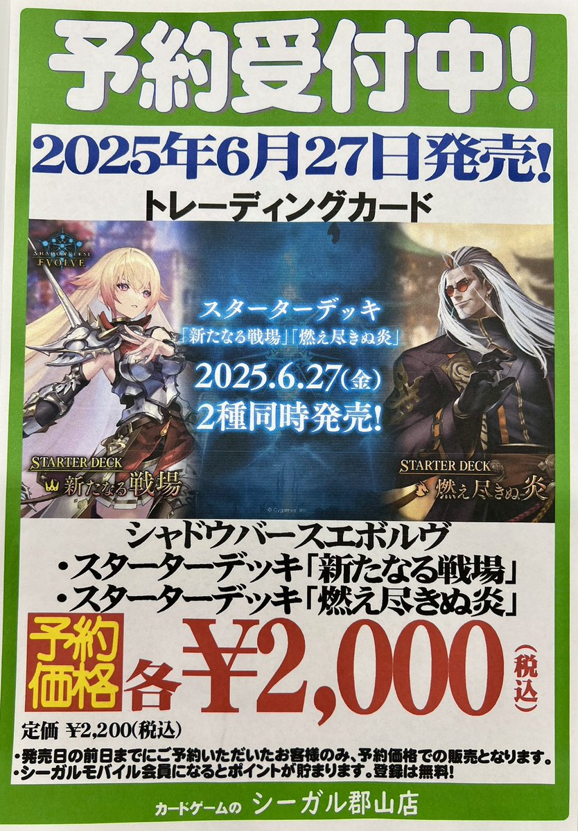 【ご予約受付中】 6/27 発売 #シャドウバースエボルヴ スターターデッキ ✅「新たなる戦場」 ✅「燃え尽きぬ炎」 7/11 発売 #シャドウバースエボルヴ ブースターパック ✅「新たなる創世」 ただいま予約受付中です❗️ ご予約お待ちしております😊 #シーガル郡山店予約