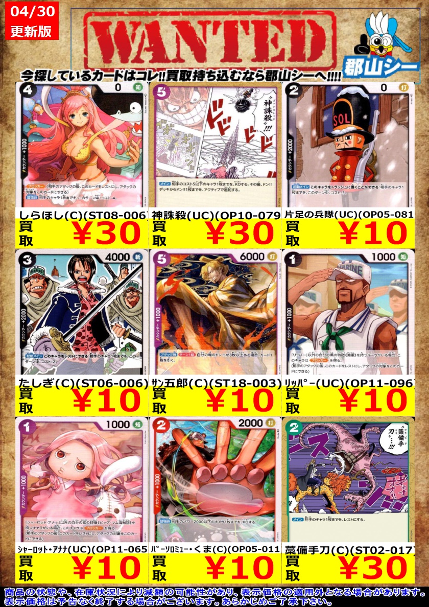シーガル郡山店ワンピースお買取り情報!※商品の状態や在庫状況により減額の可能性があり、表示価格の適用外になる場合がございます。予めご了承ください。 片足の兵隊(UC)(OP05-081) ¥10 しらほし(C)(ST08-006) ¥30 神誅殺(UC)(OP10-079) ¥30 #高価買取 #ワンピース #シーガル郡山