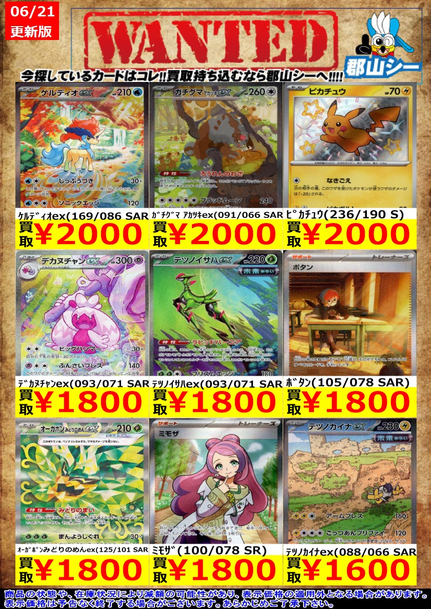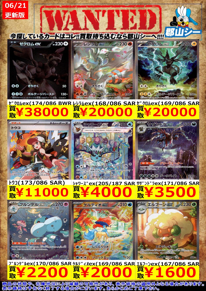 シーガル郡山店ポケカ数量限定お買取り情報更新です!よろしくお願いいたします! ※商品の状態や在庫状況により減額の可能性があり、表示価格の適用外となる場合がございます。 トウコ(166/086 SR) ¥2,700 サンダースex(209/187 SAR) ¥3,800 シャワーズex(205/187 SAR) ¥4,300