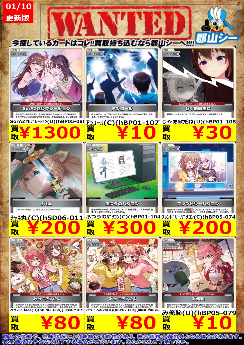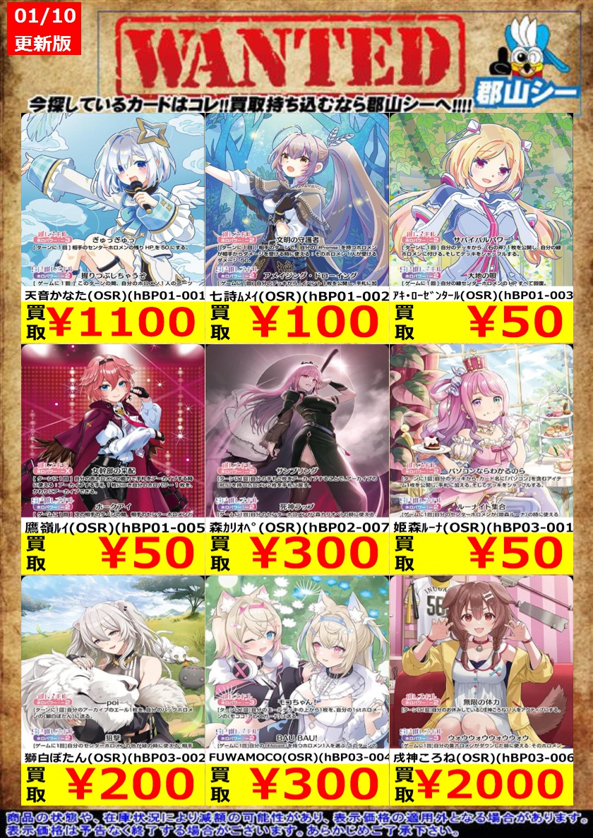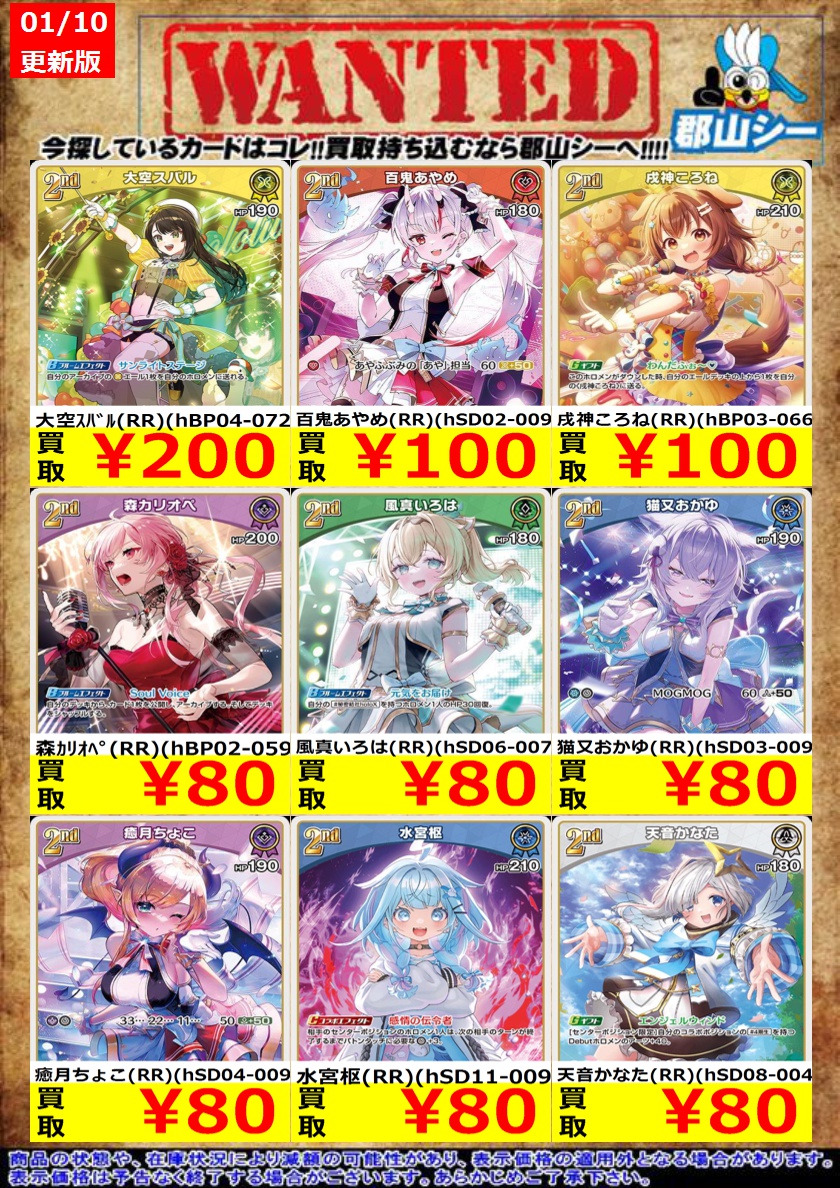 シーガル郡山店ホロライブOCGお買取り情報!! ※商品の状態や在庫状況により減額の可能性があり、表示価格の適用外となる場合がございます。 風真いろは(OSR)(hBP06-003) ¥1,100 百鬼あやめ(OSR)(hBP06-004) ¥1,200 ロボ子さん(OSR)(hBP06-007) ¥100
