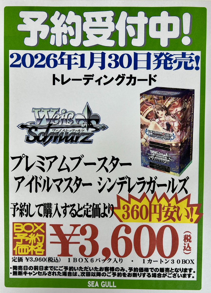 【ご予約受付中】 1/30(金) 発売 #ヴァイスシュヴァルツ プレミアムブースター ✅ 「アイドルマスター シンデレラガールズ」 ただいま予約受付中です❗️ ご予約お待ちしております😊 #シーガル郡山店予約