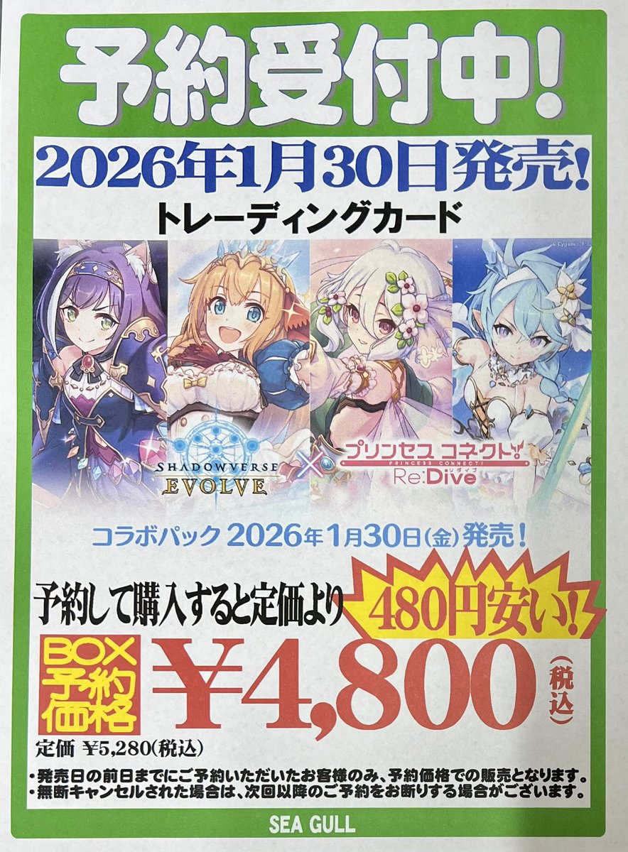 【ご予約受付中】 1/30(金) 発売 #シャドウバースエボルヴ コラボパック ✅ 「プリンセスコネクト!Re:Dive」 ただいま予約受付中です❗️ ご予約お待ちしております😊 #シーガル郡山店予約
