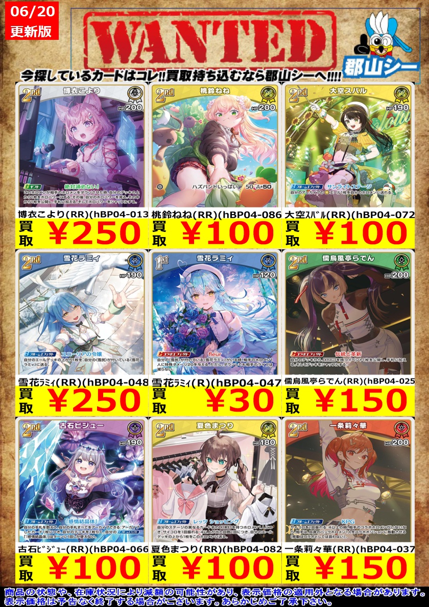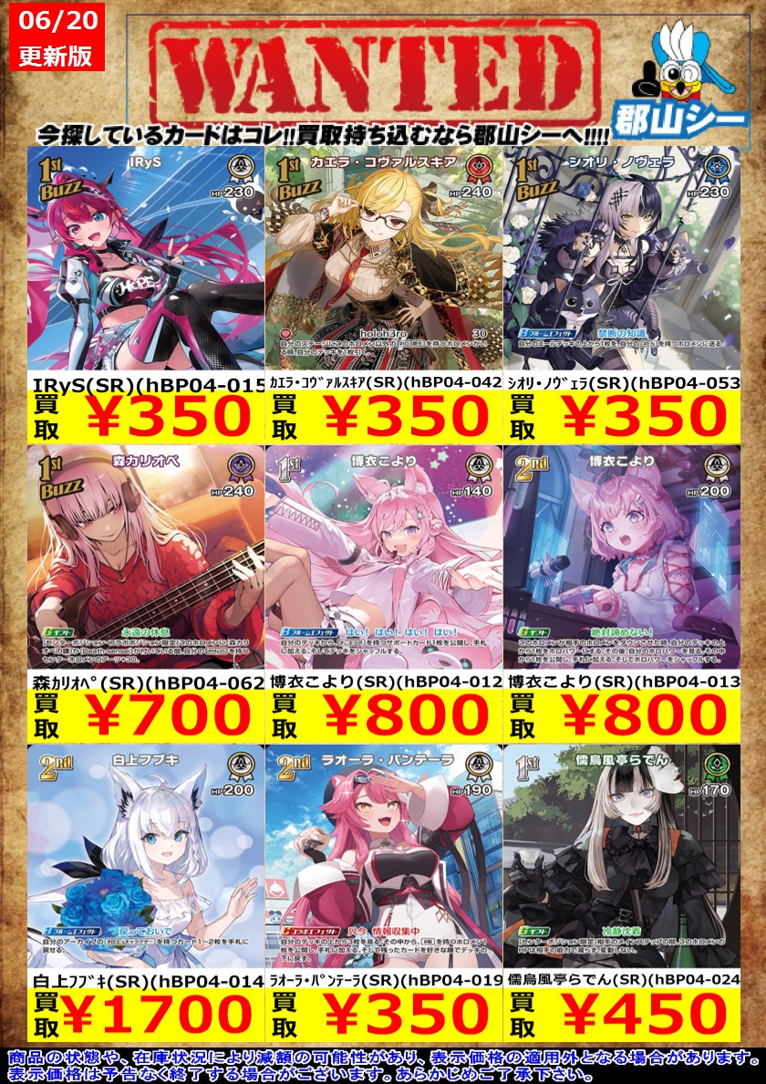 シーガル郡山店ホロライブOCGお買取り情報!! ※商品の状態や在庫状況により減額の可能性があり、表示価格の適用外となる場合がございます。 こよりの助手くん(S)(hBP04-105) ¥200 IRyS(SR)(hBP04-015) ¥350 ラオーラ・パンテーラ(SR)(hBP04-019) ¥350