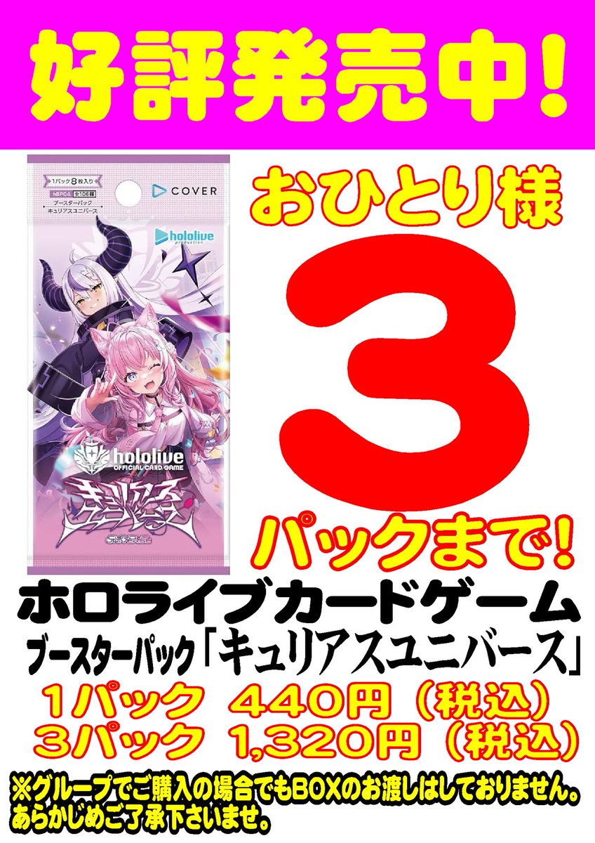 本日発売🎉 #ホロライブOCG ✅ブースターパック 『キュリアスユニバース』 ※お一人様3パックまでの販売とさせていただきます。 皆様のご来店をお待ちしております😊