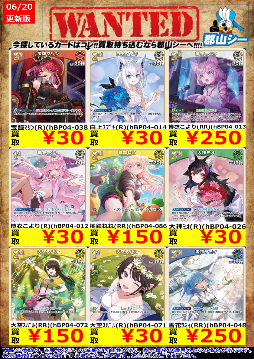 シーガル郡山店ホロライブOCGノーマルお買取り情報!! ※商品の状態や在庫状況により減額の可能性があり、表示価格の適用外となる場合がございます。 博衣こより(U)(hBP04-011) ¥10 ラオーラ・パンテーラ(U)(hBP04-018) ¥10 儒烏風亭らでん(U)(hBP04-023) ¥10