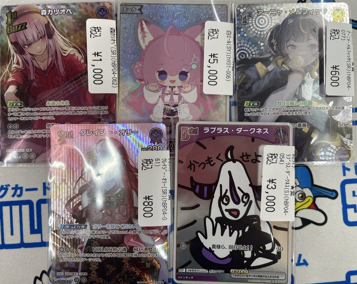 シーガル郡山店ホロライブOCGお買取り情報!! ※商品の状態や在庫状況により減額の可能性があり、表示価格の適用外となる場合がございます。 アーニャ・メルフィッサ(OSR)(hBP04-007) ¥300 一条莉々華(OSR)(hBP04-003) ¥500 儒烏風亭らでん(OSR)(hBP04-002) ¥500