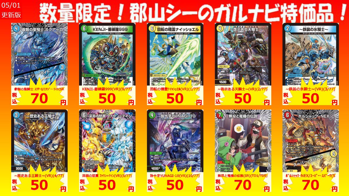 数量限定!郡山シー限定ガルナビ特価品 竜社長 ゴルファウンデーション(SR)(S8/S11) ¥250 貴布人 テブルカッケ=エディ(VR)(6/77) ¥350 ~歴史ある王騎士~(VR)(4/77) ¥50 #デュエマ #シーガル郡山 #アツアツ特価