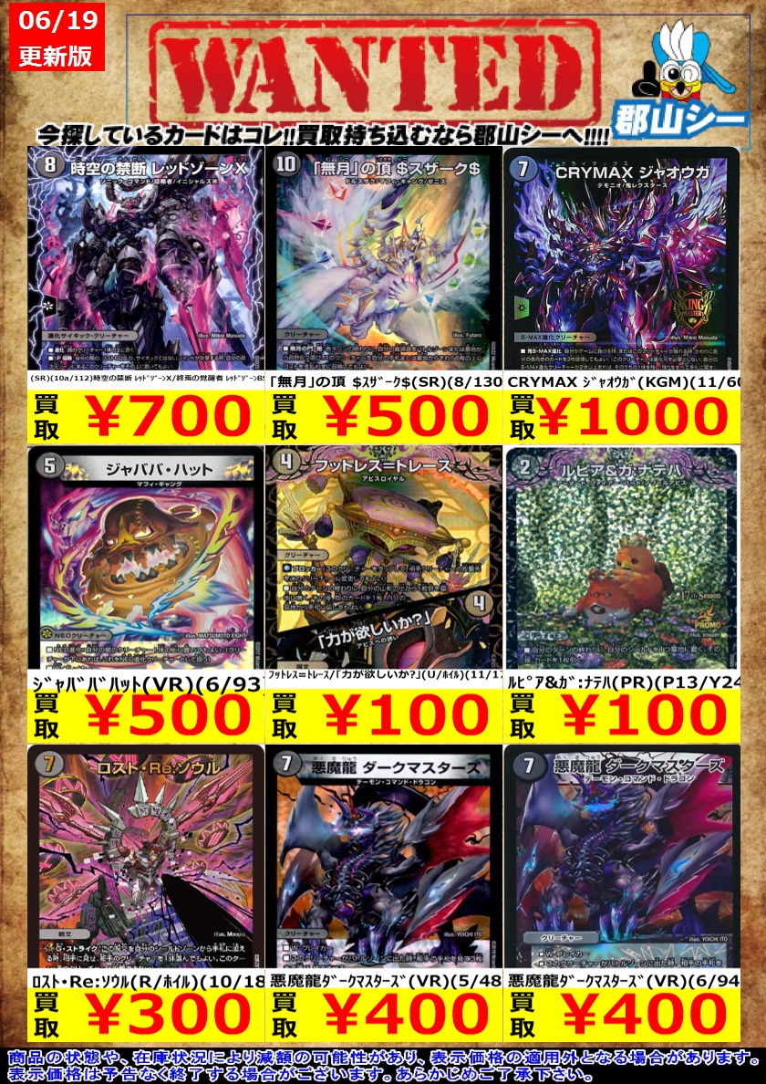 シーガル郡山店デュエマお買取り情報!! ※商品の状態や在庫状況により減額の可能性があり、表示価格の適用外となる場合がございます。 ルピア&ガ:ナテハ(PR)(P13/Y24) ¥100 ロスト・Re:ソウル(R/ホイル)(10/18) ¥300 「無月」の頂 $スザーク$(SR)(8/130) ¥500