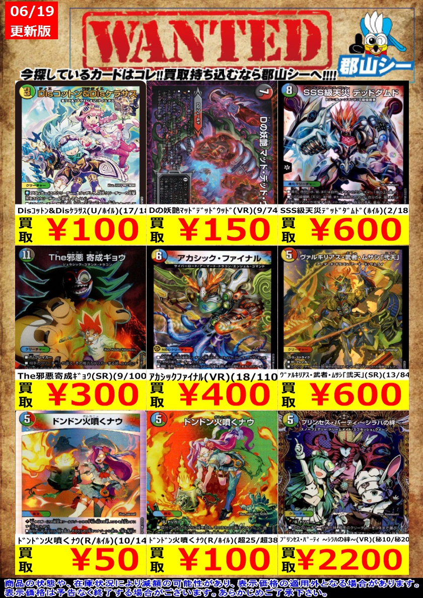 シーガル郡山店デュエマお買取り情報!! ※商品の状態や在庫状況により減額の可能性があり、表示価格の適用外となる場合がございます。 ドンドン火噴くナウ(R/ホイル)(10/14) ¥50 Disアイ・チョイス(VR)(35/112) ¥100 メンデルスゾーン(ホイル)(15/19) ¥150