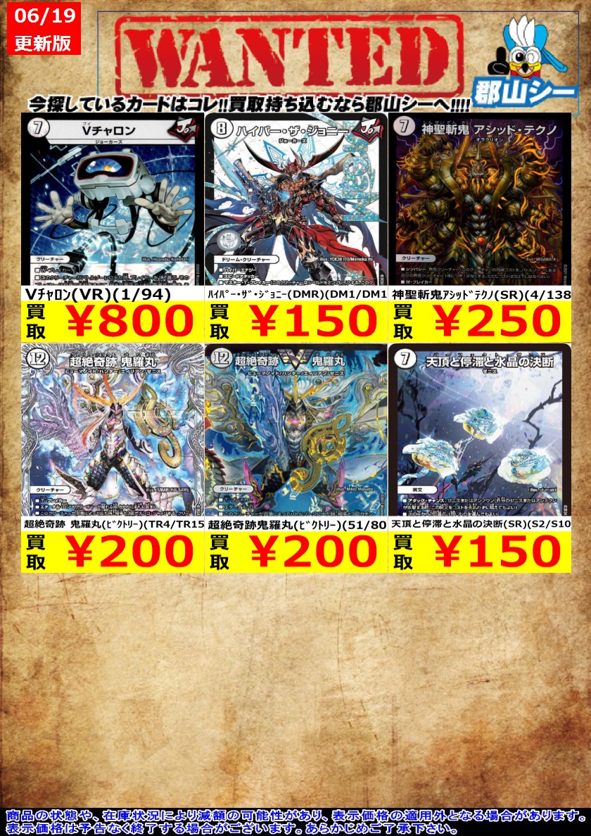 シーガル郡山店デュエマお買取り情報!! ※商品の状態や在庫状況により減額の可能性があり、表示価格の適用外となる場合がございます。 ハイパー・ザ・ジョニー(DMR)(DM1/DM1) ¥150 Vチャロン(VR)(1/94) ¥800 天頂と停滞と水晶の決断(SR)(S2/S10) ¥150