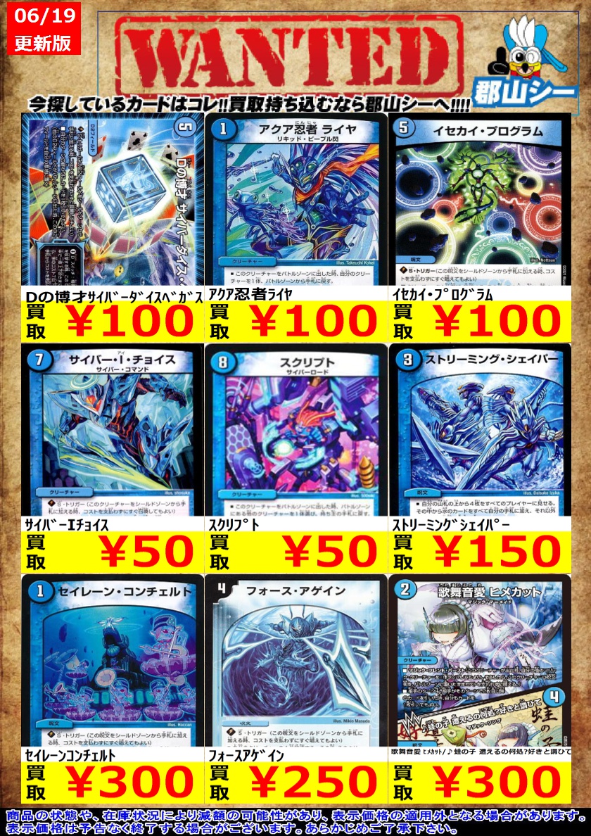 シーガル郡山店デュエマノーマルお買取り情報!! ※商品の状態や在庫状況により減額の可能性があり、表示価格の適用外となる場合がございます。 堕呪ギャプドゥ ¥50 水面護りハコフ/蓄積された魔力の縛り ¥50 堕呪ウキドゥ ¥70