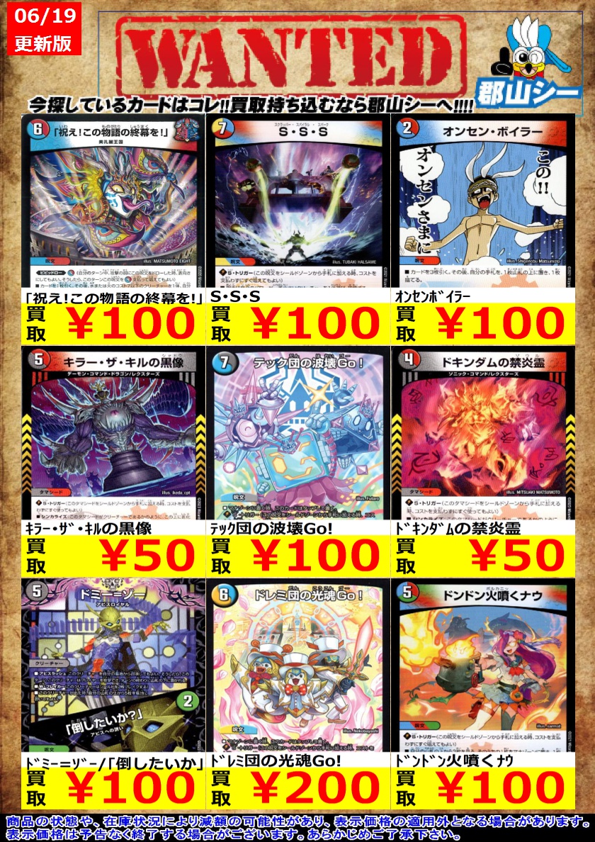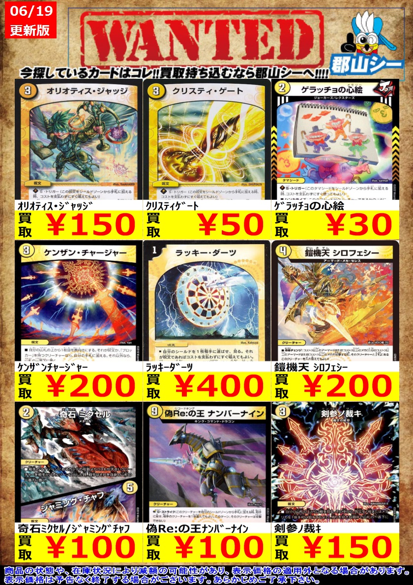 シーガル郡山店デュエマノーマルお買取り情報!! ※商品の状態や在庫状況により減額の可能性があり、表示価格の適用外となる場合がございます。 偽Re:の王ナンバーナイン ¥100 剣参ノ裁キ ¥150 太陽の精霊龍ルルフェンズ ¥200