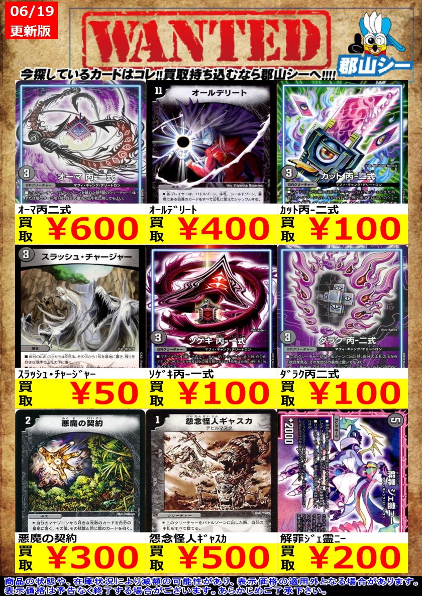 シーガル郡山店デュエマノーマルお買取り情報!! ※商品の状態や在庫状況により減額の可能性があり、表示価格の適用外となる場合がございます。 魔誕幻獣ボンメェ ¥30 鬼寄せの術 ¥50 地龍神の魔陣 ¥50
