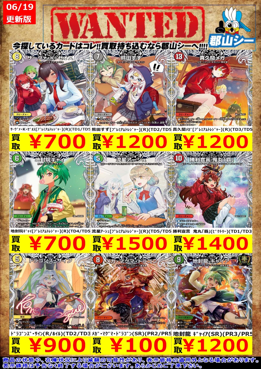 シーガル郡山店デュエマお買取り情報!! ※商品の状態や在庫状況により減額の可能性があり、表示価格の適用外となる場合がございます。 地封龍 ギャイア(SR)(PR3/PR5) ¥1,200 悪魔龍 ダークマスターズ(VR)(PR5/PR5) ¥500 ドラゴンズ・サイン(R/ホイル)(TD2/TD3) ¥900