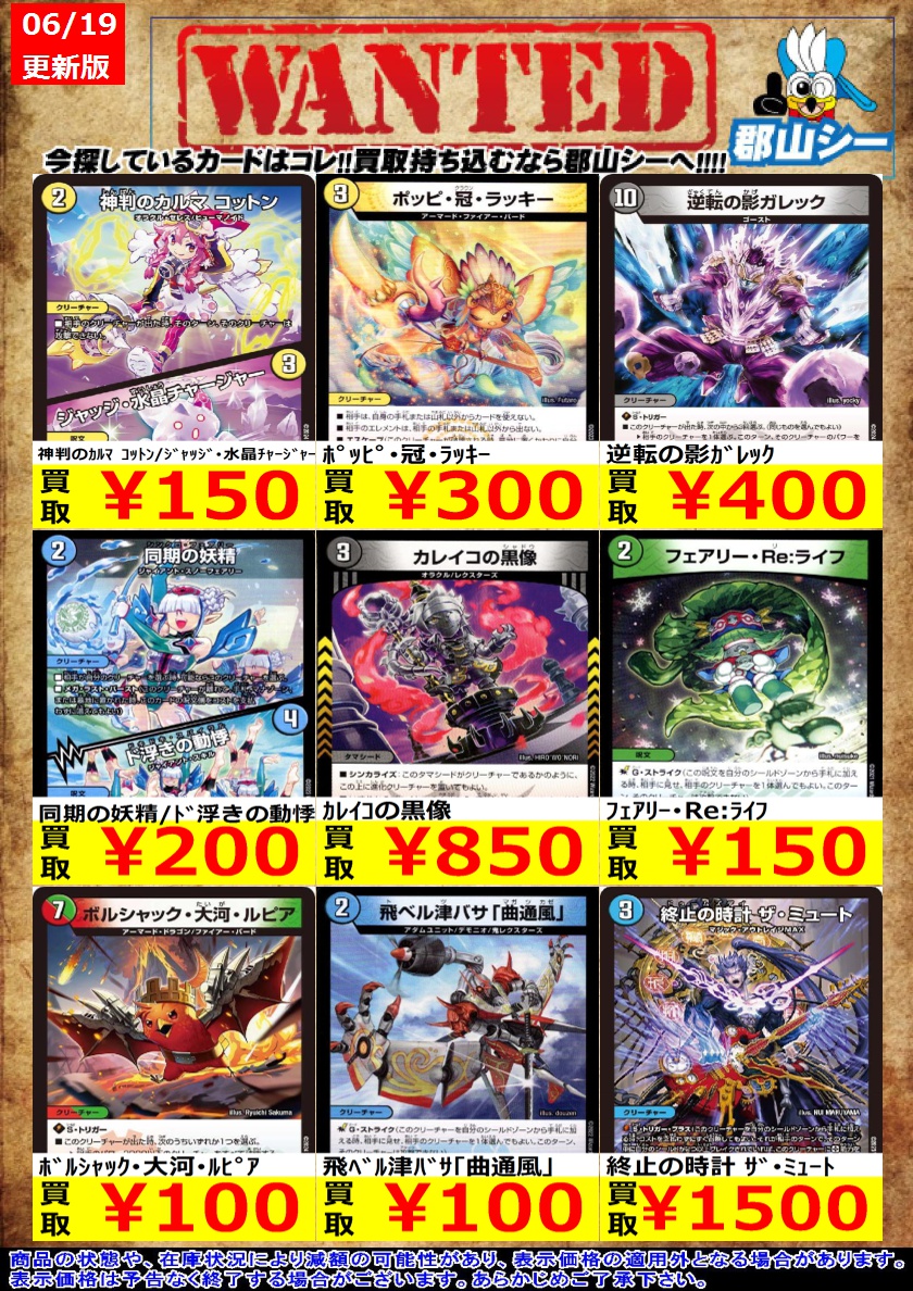 シーガル郡山店デュエマノーマルお買取り情報!! ※商品の状態や在庫状況により減額の可能性があり、表示価格の適用外となる場合がございます。 飛ベル津バサ「曲通風」 ¥100 神判のカルマ コットン/ジャッジ・水晶チャージャー ¥150 同期の妖精/ド浮きの動悸 ¥200