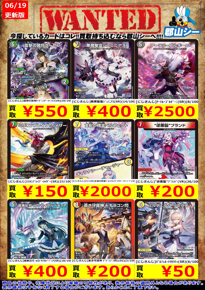 シーガル郡山店デュエマお買取り情報!! ※商品の状態や在庫状況により減額の可能性があり、表示価格の適用外となる場合がございます。 [にじさんじ]悪魔聖霊ジェミニアス(SR)(14/100) ¥400 [にじさんじ]雷撃の冥将クーゼン/ダーク・ライフ(VR)(39/100) ¥550