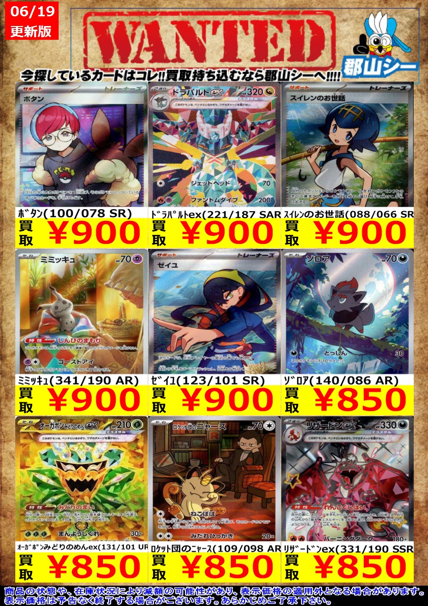 シーガル郡山店ポケカ数量限定お買取り情報更新です!よろしくお願いいたします! ※商品の状態や在庫状況により減額の可能性があり、表示価格の適用外となる場合がございます。 ガマゲロゲ(109/086 AR) ¥1,100 ゾロアーク(141/086 AR) ¥1,100 ミジュマル(102/086 AR) ¥1,100