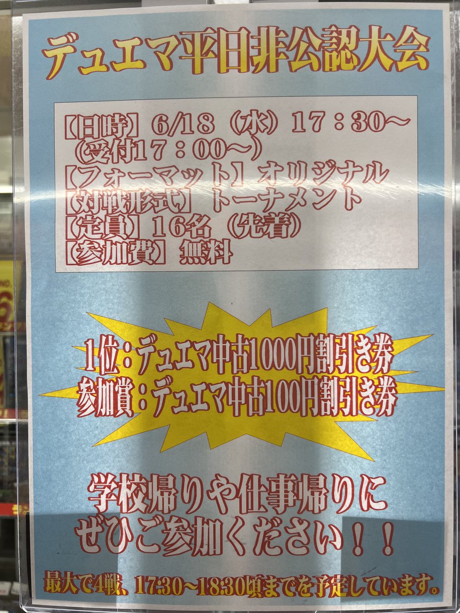 本日17:30〜 いつもの! デュエマ平日非公認大会やります! 参加費無料となっておりますので是非ぜひ遊びに来てくださいね(*´ω`*)