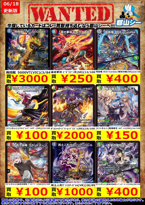 シーガル郡山店デュエマお買取り情報!! ※商品の状態や在庫状況により減額の可能性があり、表示価格の適用外となる場合がございます。 飛ベル津バサ「曲通風」 ¥100 ポッピ・冠・ラッキー ¥300 逆転の影ガレック ¥300