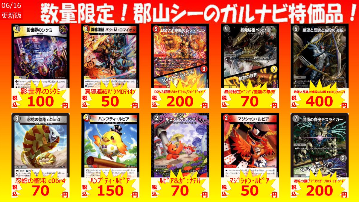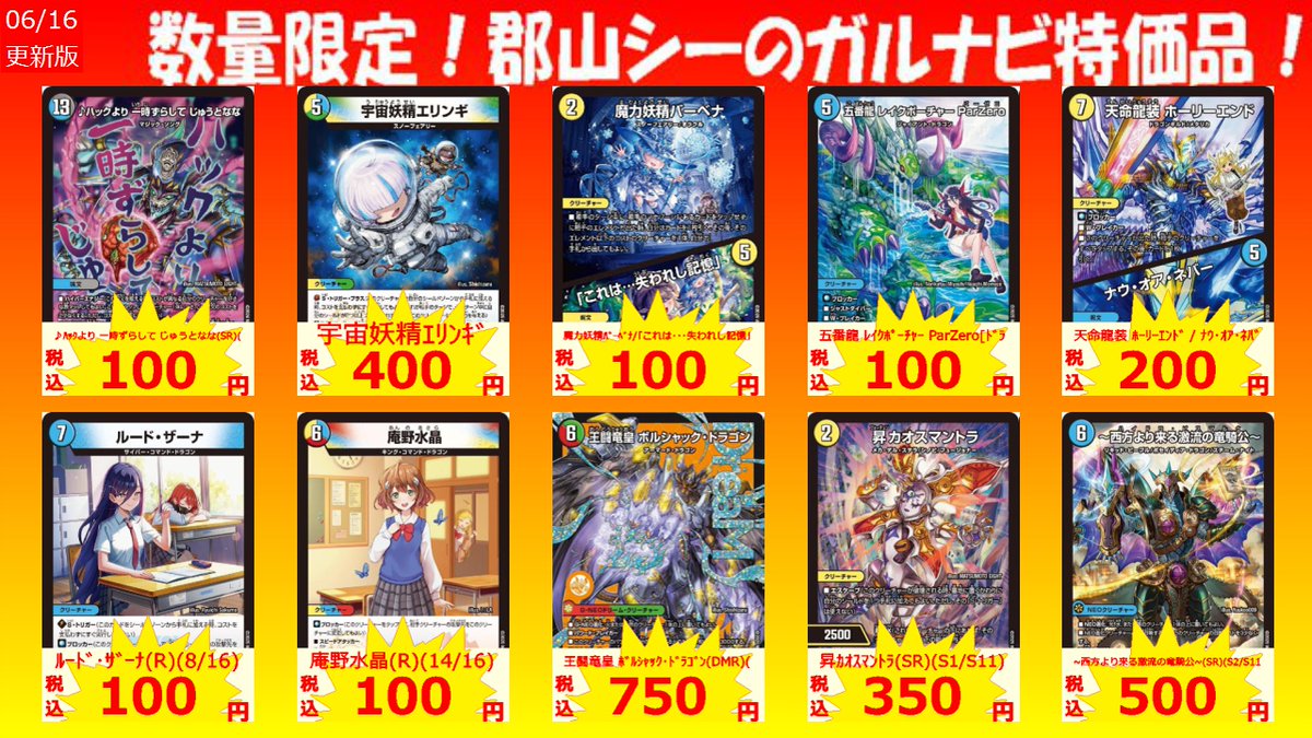 数量限定!郡山シー限定ガルナビ特価品 竜社長 ゴルファウンデーション(SR)(S8/S11) ¥250 昇カオスマントラ(SR)(S1/S11) ¥350 ルード・ザーナ(R)(8/16) ¥100 #デュエマ #シーガル郡山 #アツアツ特価