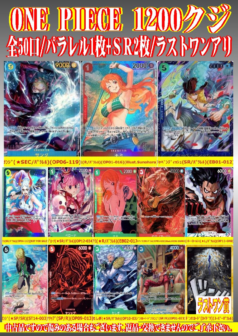シーガル郡山店です。 ワンピ1200円クジ作成致しました‼️ 全50口でラストワンありとなっております。 ぜひ、よろしくお願いします。