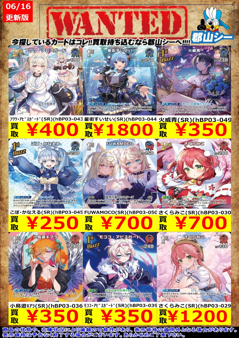 シーガル郡山店ホロライブOCGお買取り情報!! ※商品の状態や在庫状況により減額の可能性があり、表示価格の適用外となる場合がございます。 赤井はあと(UR)(hBP03-034) ¥800 不知火フレア(UR)(hBP03-079) ¥1,100 大神ミオ(UR)(hBP02-027) ¥2,500
