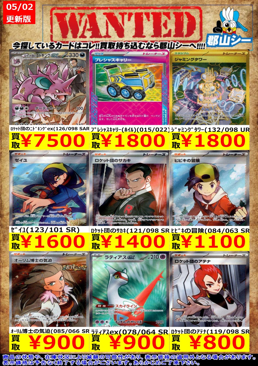 シーガル郡山店ポケカ数量限定買取情報更新です!よろしくお願いいたします! ※商品の状態や在庫状況により減額の可能性があり、表示価格の適用外となる場合がございます。 リーリエのピッピex(033/100 RR) ¥100 ロケット団のワナイダー(009/098 R) ¥100 ロケット団のびっくりボム ¥100